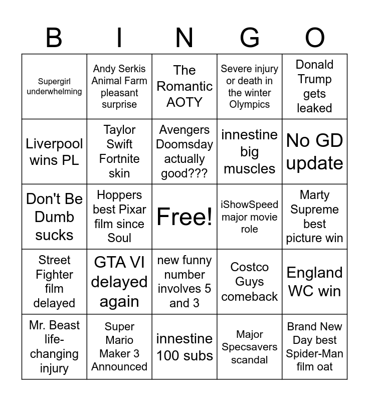 This bingo card has a free space and 24 words: GTA VI delayed again, Super Mario Maker 3 Announced, Avengers Doomsday actually good???, Mr. Beast life-changing injury, Donald Trump gets leaked, Supergirl underwhelming, Liverpool wins PL, Andy Serkis Animal Farm pleasant surprise, iShowSpeed major movie role, new funny number involves 5 and 3, innestine big muscles, Don't Be Dumb sucks, Costco Guys comeback, England WC win, Taylor Swift Fortnite skin, Major Specsavers scandal, Marty Supreme best picture win, The Romantic AOTY, No GD update, Hoppers best Pixar film since Soul, Brand New Day best Spider-Man film oat, Street Fighter film delayed, Severe injury or death in the winter Olympics and innestine 100 subs.