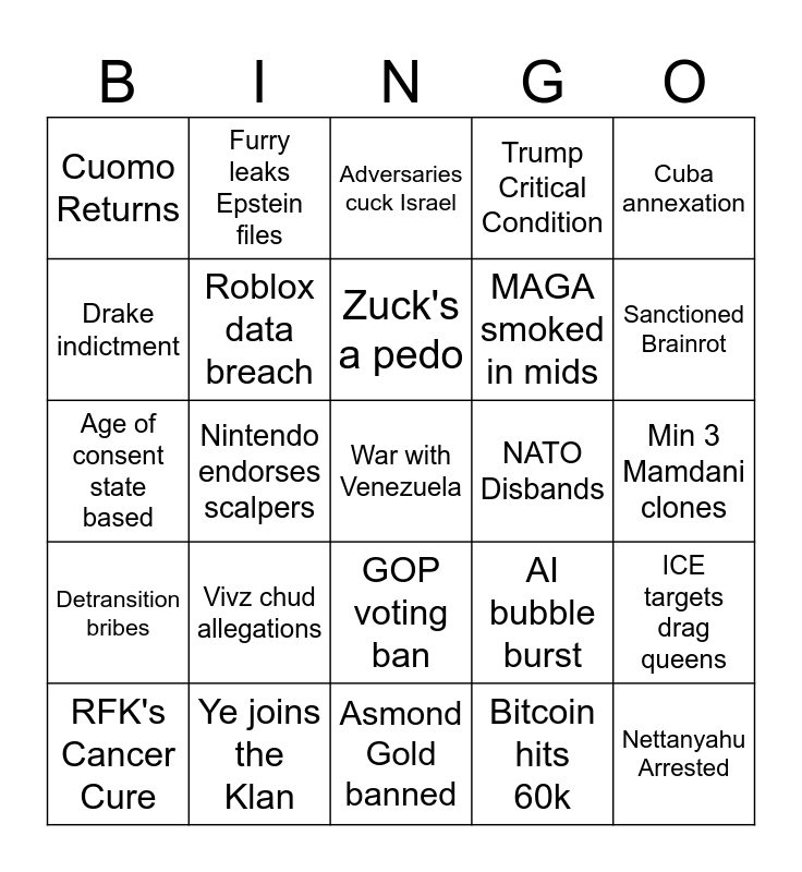 This bingo card has a free space and 24 words: Vivz chud allegations, Ye joins the Klan, Zuck's a pedo, RFK's Cancer Cure, Cuba annexation, Cuomo Returns, Drake indictment, Furry leaks Epstein files, NATO Disbands, GOP voting ban, MAGA smoked in mids, Age of consent state based, AI bubble burst, ICE targets drag queens, Roblox data breach, Bitcoin hits 60k, Min 3 Mamdani clones, Adversaries cuck Israel, Sanctioned Brainrot, Nintendo endorses scalpers, Nettanyahu Arrested, Detransition bribes, Trump Critical Condition and Asmond Gold banned.
