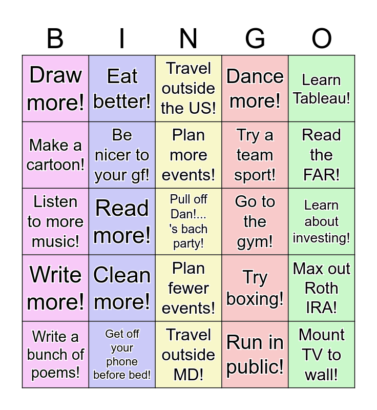 This bingo card has 25 words: Write more!, Get off your phone before bed!, Pull off Dan!... 's bach party!, Run in public!, Learn Tableau!, Draw more!, Eat better!, Travel outside the US!, Go to the gym!, Max out Roth IRA!, Make a cartoon!, Be nicer to your gf!, Travel outside MD!, Try boxing!, Read the FAR!, Write a bunch of poems!, Read more!, Plan more events!, Try a team sport!, Learn about investing!, Listen to more music!, Clean more!, Plan fewer events!, Dance more! and Mount TV to wall!.