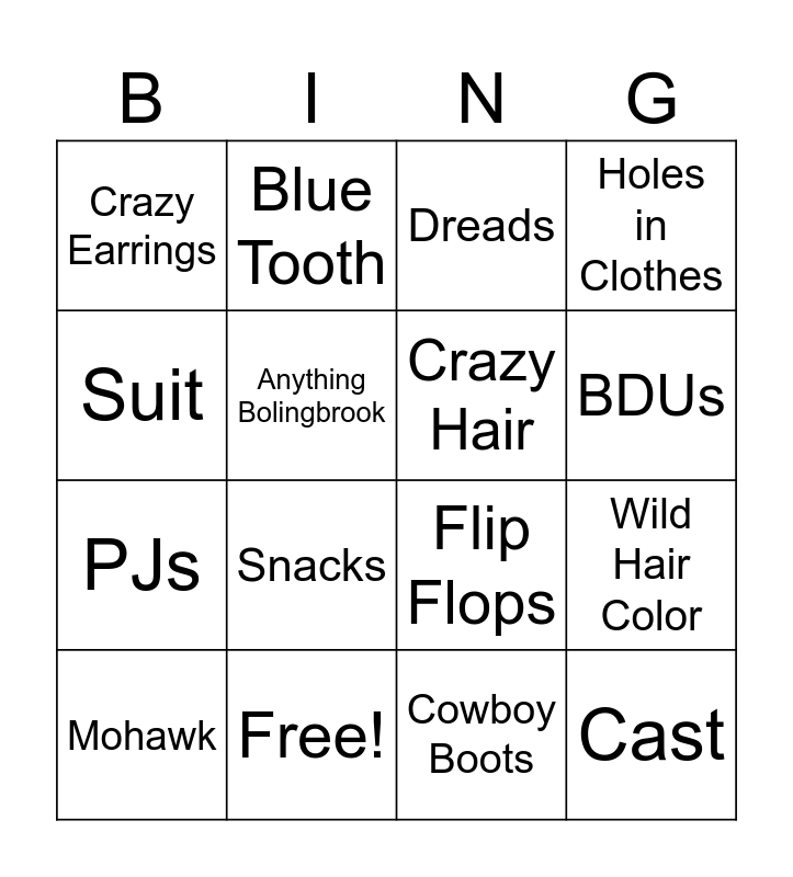 This bingo card has 21 words: Free!, Crocs, Blue Tooth, Thin Blue line, Cowboy Boots, Crazy Hair, Crazy Earrings, Dreads, Flip Flops, BDUs, PJs, Holes in Clothes, Cast, Hat, Anything Bolingbrook, Septum Piercing, Mohawk, Snacks, Suit, Wild Hair Color and Camo.