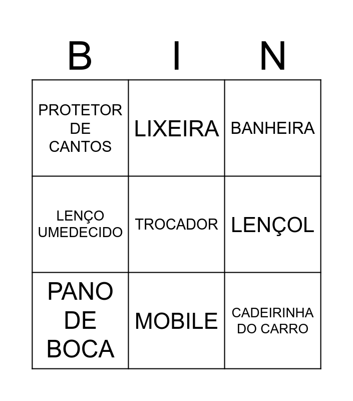 This bingo card has 43 words: MACACÃO LONGO, MEIA, BODY LONGO, CALÇA/MIJÃO, BODY CURTO, TOALHA DE BANHO, BANHEIRA, COTONETE, TROCADOR, POMADA ASSADURA, LENÇO UMEDECIDO, ALMOFADA AMAMENTAÇÃO, MAMADEIRA, CADEIRA DE REFEIÇÃO, ESCOVA PARA MAMADEIRA, BABADOR, ALGODÃO, ROSQUINHA PARA AMAMENTAÇÃO, COPO ARMAZENAMENTO DE LEITE, ESTERILIZADOR DE MAMADEIRA, LIXEIRA, CADEIRA DE BALANÇO, BABÁ ELETRÔNICA, PROTETOR DE CANTOS, KIT HIGIENE BEBE, ASPIRADOR NASAL, PRENDEDOR DE CHUPETA, CHUPETA, MORDEDOR, KIT LAVAGEM NASAL, TERMÔMETRO BANHEIRA, SUPORTE PARA BABA ELETRÔNICA, ABAJUR COM SOM, SACO DE DORMIR, MANTA, CUEIRO, PROTETOR DE COLCHÃO, MOBILE, LENÇOL, CADEIRINHA DO CARRO, CARRINHO + BEBE CONFORTO, PANO DE BOCA and CANGURU.