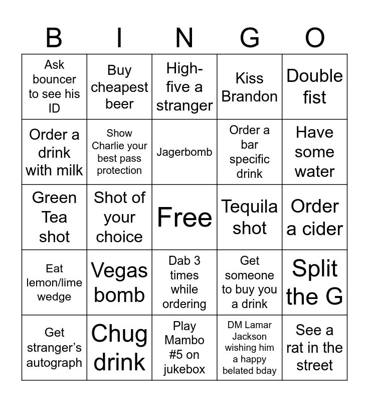 This bingo card has a free space and 24 words: Vegas bomb, Chug drink, Jagerbomb, Get stranger’s autograph, Double fist, Ask bouncer to see his ID, Order a drink with milk, Buy cheapest beer, Tequila shot, Dab 3 times while ordering, Order a bar specific drink, Green Tea shot, Get someone to buy you a drink, Split the G, Show Charlie your best pass protection, DM Lamar Jackson wishing him a happy belated bday, Order a cider, High-five a stranger, Have some water, Shot of your choice, See a rat in the street, Eat lemon/lime wedge, Kiss Brandon and Play Mambo #5 on jukebox.