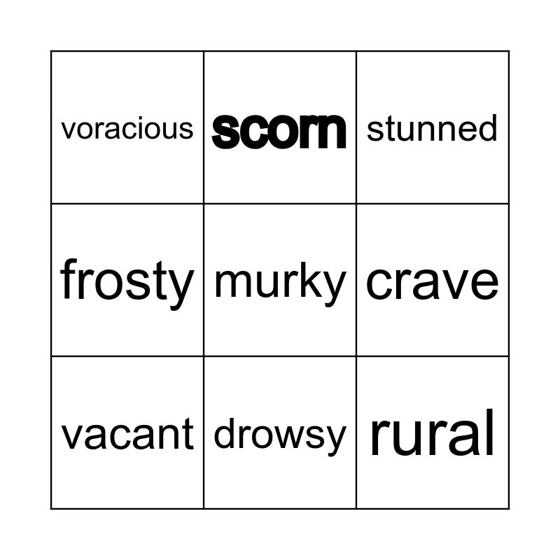 This bingo card has a free space and 8 words: crave, stunned, scorn, vacant, voracious, rural, frosty and drowsy.