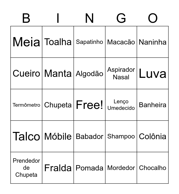 This bingo card has a free space and 30 words: Fralda, Body, Chupeta, Mamadeira, Meia, Sapatinho, Manta, Babador, Lenço Umedecido, Pomada, Banheira, Chocalho, Mordedor, Touca, Luva, Sabonete, Shampoo, Talco, Móbile, Naninha, Termômetro, Escova de Cabelo, Toalha, Aspirador Nasal, Cueiro, Macacão, Colônia, Prendedor de Chupeta, Algodão and Almofada de Amamentação..