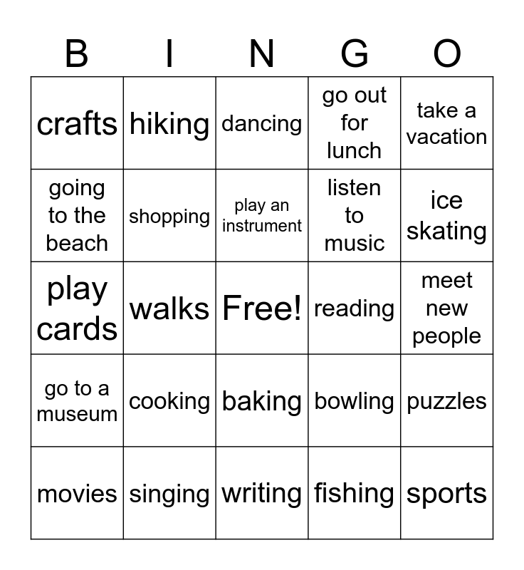 This bingo card has a free space and 24 words: cooking, singing, play an instrument, movies, take a vacation, crafts, going to the beach, hiking, reading, baking, listen to music, play cards, bowling, puzzles, shopping, fishing, meet new people, dancing, ice skating, walks, sports, go to a museum, go out for lunch and writing.