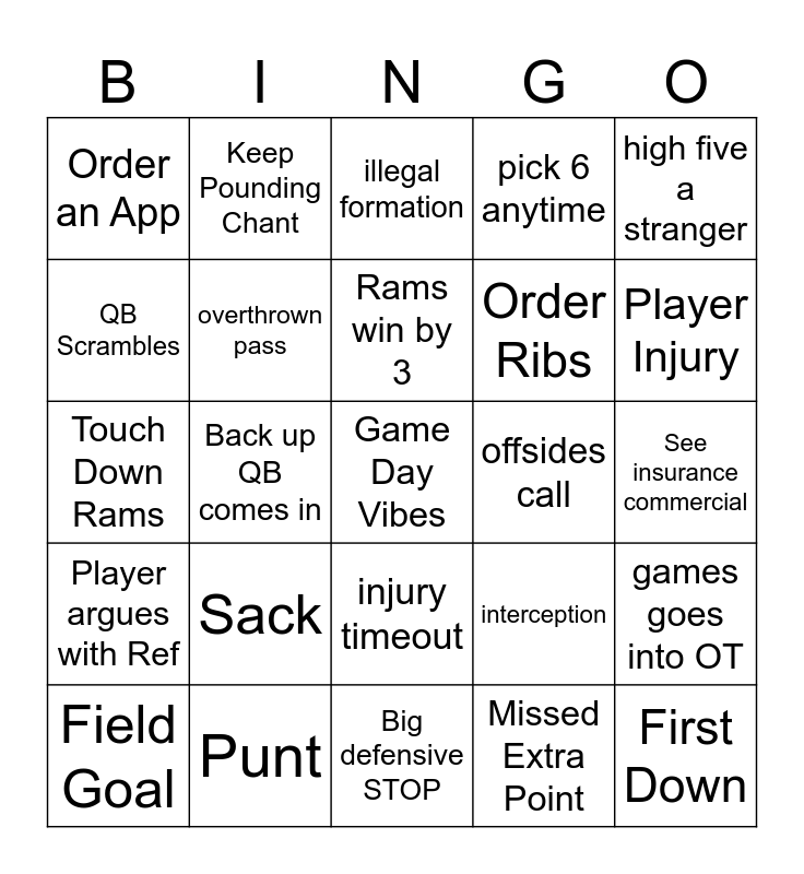 This bingo card has a free space and 29 words: Field Goal, Offensive Time Out, Back up QB comes in, Touch Down Panthers, Order an App, illegal formation, overthrown pass, Sack, offsides call, Punt, See insurance commercial, First Down, Big defensive STOP, Missed Extra Point, Player Injury, Switch seat for good luck, injury timeout, Player argues with Ref, high five a stranger, Touch Down Rams, interception, challenge flag thrown, Order Ribs, QB Scrambles, pick 6 anytime, Keep Pounding Chant, games goes into OT, Rams win by 3 and Panthers win by 6.