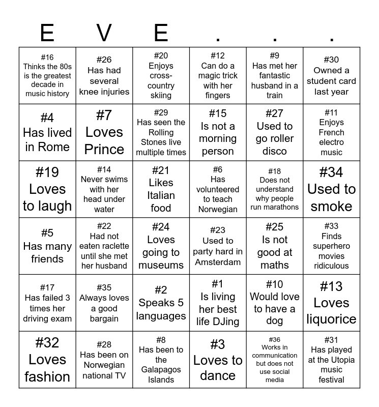 This bingo card has 36 words: #1 Is living her best life DJing, #2 Speaks 5 languages, #3 Loves to dance, #4 Has lived in Rome, #5 Has many friends, #6 Has volunteered to teach Norwegian, #7 Loves Prince, #8 Has been to the Galapagos Islands, #9 Has met her fantastic husband in a train, #10 Would love to have a dog, #11 Enjoys French electro music, #12 Can do a magic trick with her fingers, #13 Loves liquorice, #14 Never swims with her head under water, #15 Is not a morning person, #16 Thinks the 80s is the greatest decade in music history, #17 Has failed 3 times her driving exam, #18 Does not understand why people run marathons, #19 Loves to laugh, #20 Enjoys cross-country skiing, #21 Likes Italian food, #22 Had not eaten raclette until she met her husband, #23 Used to party hard in Amsterdam, #24 Loves going to museums, #25 Is not good at maths, #26 Has had several knee injuries, #27 Used to go roller disco, #28 Has been on Norwegian national TV, #29 Has seen the Rolling Stones live multiple times, #30 Owned a student card last year, #31 Has played at the Utopia music festival, #32 Loves fashion, #33 Finds superhero movies ridiculous, #34 Used to smoke, #35 Always loves a good bargain and #36 Works in communication but does not use social media.
