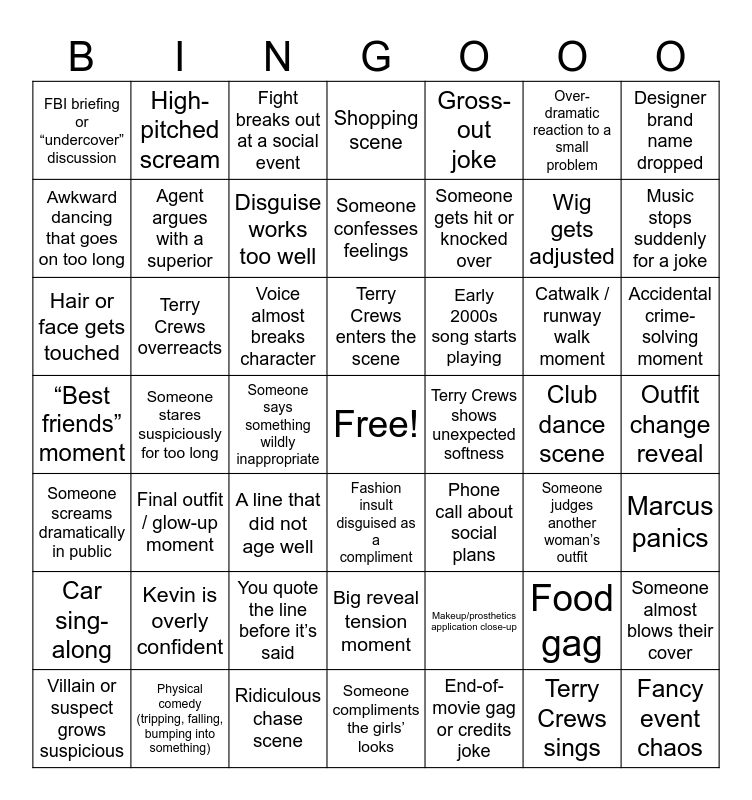 This bingo card has a free space and 48 words: Makeup/prosthetics application close-up, Wig gets adjusted, Someone compliments the girls’ looks, Someone stares suspiciously for too long, Voice almost breaks character, Outfit change reveal, High-pitched scream, Physical comedy (tripping, falling, bumping into something), Over-dramatic reaction to a small problem, Fashion insult disguised as a compliment, Designer brand name dropped, Shopping scene, Catwalk / runway walk moment, Early 2000s song starts playing, Car sing-along, Club dance scene, Awkward dancing that goes on too long, Music stops suddenly for a joke, Food gag, Gross-out joke, Someone gets hit or knocked over, Someone says something wildly inappropriate, FBI briefing or “undercover” discussion, Agent argues with a superior, Someone almost blows their cover, Disguise works too well, Accidental crime-solving moment, Villain or suspect grows suspicious, Terry Crews enters the scene, Terry Crews overreacts, Terry Crews sings, Terry Crews shows unexpected softness, Marcus panics, Kevin is overly confident, “Best friends” moment, Phone call about social plans, Someone judges another woman’s outfit, Hair or face gets touched, A line that did not age well, You quote the line before it’s said, Someone screams dramatically in public, Fancy event chaos, Fight breaks out at a social event, Ridiculous chase scene, Someone confesses feelings, Big reveal tension moment, Final outfit / glow-up moment and End-of-movie gag or credits joke.