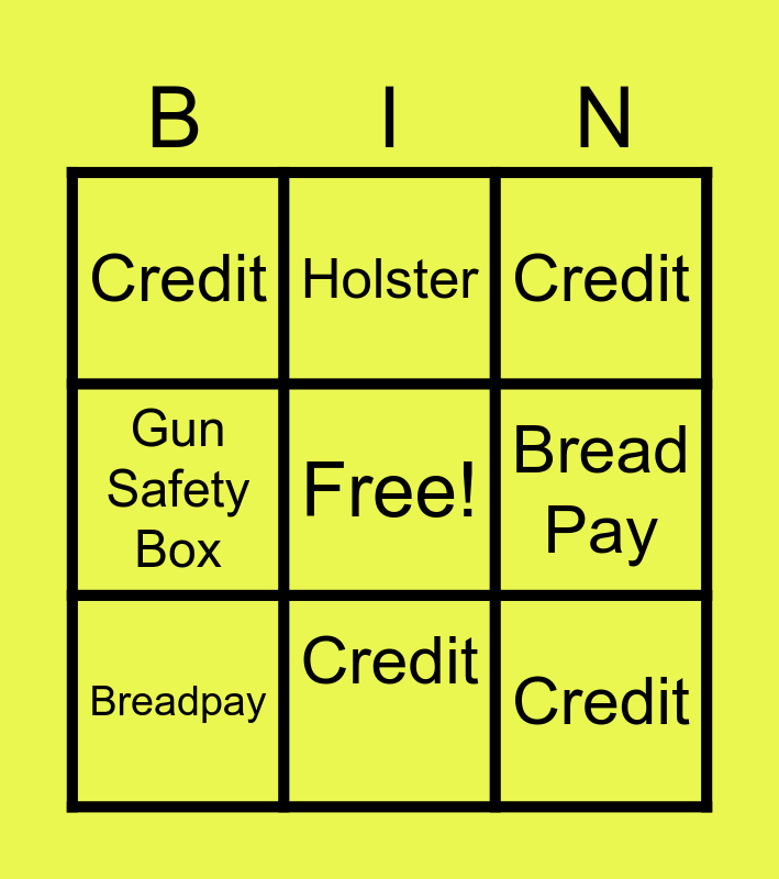 This bingo card has a free space and 8 words: Bread Pay, Credit, Holster, Breadpay, Credit, Credit, Gun Safety Box and Credit.