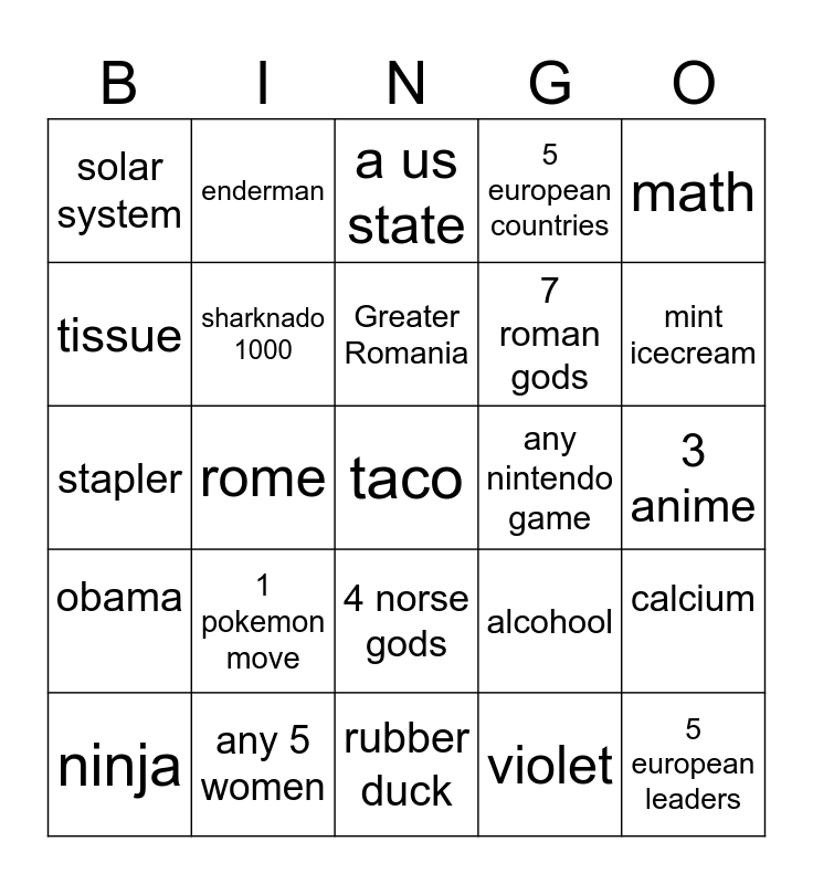 This bingo card has 25 words: obama, any 5 women, taco, violet, math, solar system, enderman, a us state, any nintendo game, calcium, tissue, sharknado 1000, rubber duck, alcohool, mint icecream, ninja, rome, Greater Romania, 7 roman gods, 3 anime, stapler, 1 pokemon move, 4 norse gods, 5 european countries and 5 european leaders.