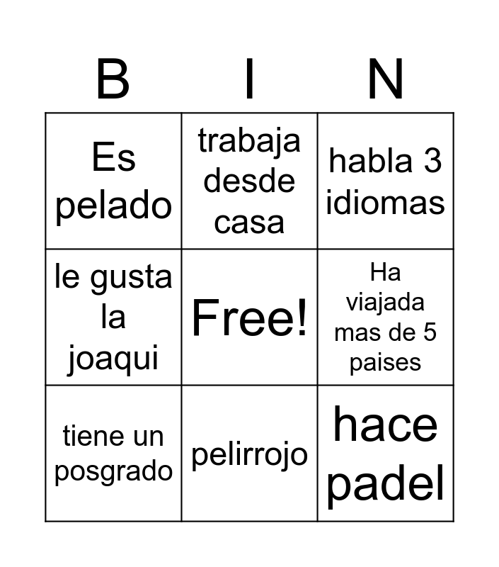 This bingo card has a free space and 8 words: Ha viajada mas de 5 paises, habla 3 idiomas, trabaja desde casa, tiene un posgrado, Es pelado, hace padel, le gusta la joaqui and pelirrojo.