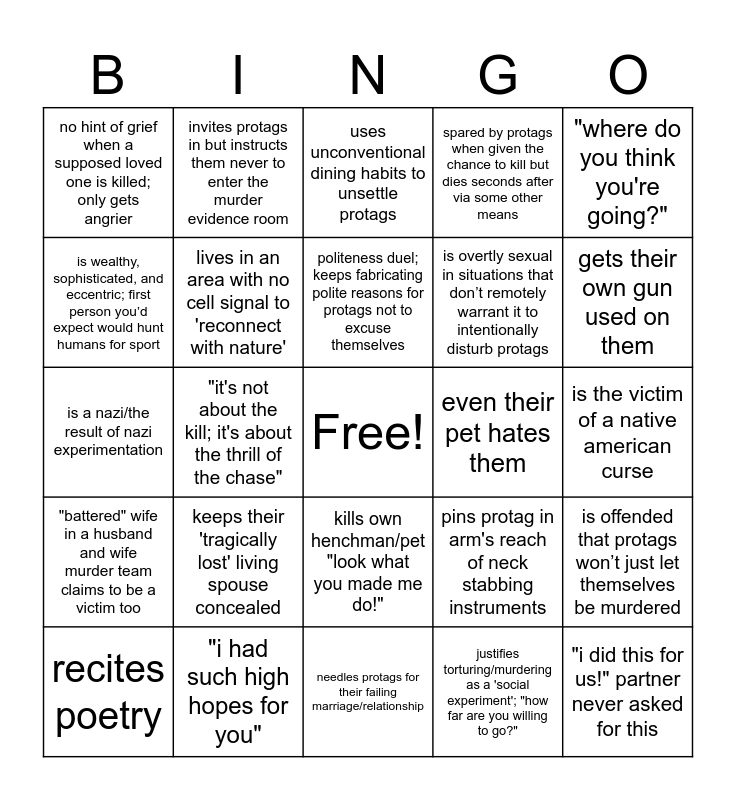 This bingo card has a free space and 29 words: recites poetry, "you think this will keep me out?!", "it's not about the kill; it's about the thrill of the chase", trapped/restrained by the same means they just used on the protags, no hint of grief when a supposed loved one is killed; only gets angrier, uses unconventional dining habits to unsettle protags, lives in an area with no cell signal to 'reconnect with nature', keeps their 'tragically lost' living spouse concealed, even their pet hates them, "i had such high hopes for you", is the victim of a native american curse, "i did this for us!" partner never asked for this, needles protags for their failing marriage/relationship, justifies torturing/murdering as a 'social experiment'; "how far are you willing to go?", gets their own gun used on them, claims to be a doctor; isn't a doctor, kills own henchman/pet "look what you made me do!", "battered" wife in a husband and wife murder team claims to be a victim too, "where do you think you're going?", is a nazi/the result of nazi experimentation, pins protag in arm's reach of neck stabbing instruments, "you're not in control here!", is overtly sexual in situations that don’t remotely warrant it to intentionally disturb protags, is wealthy, sophisticated, and eccentric; first person you’d expect would hunt humans for sport, spared by protags when given the chance to kill but dies seconds after via some other means, invites protags in but instructs them never to enter the murder evidence room, is offended that protags won’t just let themselves be murdered, politeness duel; keeps fabricating polite reasons for protags not to excuse themselves and killed mid-monologue.