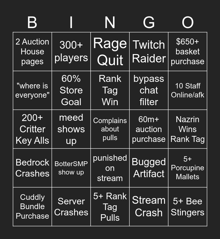 This bingo card has a free space and 24 words: BotterSMP show up, Server Crashes, Rank Tag Win, Cuddly Bundle Purchase, $650+ basket purchase, 2 Auction House pages, "where is everyone", 300+ players, 60m+ auction purchase, punished on stream, bypass chat filter, 200+ Critter Key Alls, Bugged Artifact, 5+ Porcupine Mallets, 60% Store Goal, Stream Crash, Nazrin Wins Rank Tag, Rage Quit, 10 Staff Online/afk, meed shows up, 5+ Bee Stingers, Bedrock Crashes, Twitch Raider and 5+ Rank Tag Pulls.