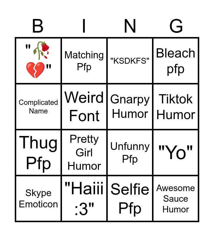This bingo card has 16 words: "Haiii :3", "Yo", "KSDKFS", "🥀💔", Thug Pfp, Matching Pfp, Unfunny Pfp, Selfie Pfp, Complicated Name, Weird Font, Skype Emoticon, Bleach pfp, Pretty Girl Humor, Tiktok Humor, Gnarpy Humor and Awesome Sauce Humor.
