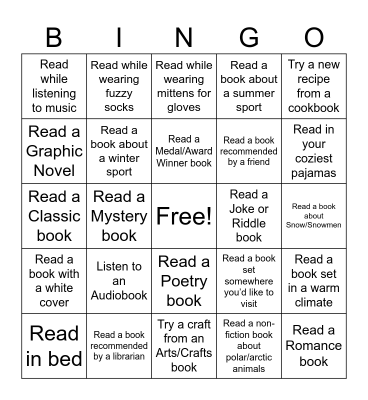 This bingo card has a free space and 24 words: Listen to an Audiobook, Read a book recommended by a librarian, Read a Medal/Award Winner book, Read in bed, Try a new recipe from a cookbook, Read while listening to music, Read a Graphic Novel, Read while wearing fuzzy socks, Read a Joke or Riddle book, Read a Poetry book, Read a book recommended by a friend, Read a Classic book, Read a book set somewhere you’d like to visit, Read a book set in a warm climate, Read a book about a winter sport, Read a non-fiction book about polar/arctic animals, Read a book about Snow/Snowmen, Read while wearing mittens for gloves, Read in your coziest pajamas, Read a Mystery book, Read a Romance book, Read a book with a white cover, Read a book about a summer sport and Try a craft from an Arts/Crafts book.