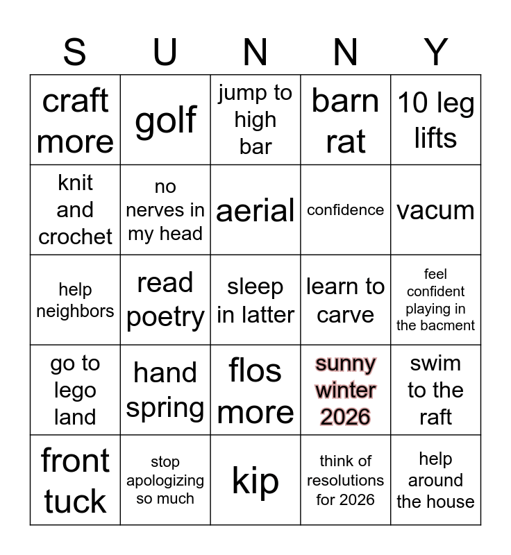 This bingo card has 25 words: hand spring, kip, aerial, front tuck, 10 leg lifts, craft more, knit and crochet, golf, learn to carve, flos more, confidence, help neighbors, sunny winter 2026, swim to the raft, no nerves in my head, help around the house, feel confident playing in the bacment, jump to high bar, vacum, read poetry, sleep in latter, stop apologizing so much, go to lego land, barn rat and think of resolutions for 2026.
