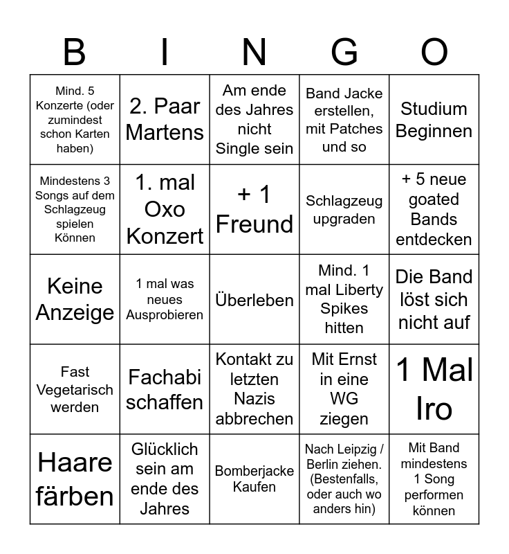 This bingo card has a free space and 24 words: Fachabi schaffen, Glücklich sein am ende des Jahres, + 1 Freund, Haare färben, Studium Beginnen, Mind. 5 Konzerte (oder zumindest schon Karten haben), Mindestens 3 Songs auf dem Schlagzeug spielen Können, 2. Paar Martens, Mind. 1 mal Liberty Spikes hitten, Kontakt zu letzten Nazis abbrechen, Schlagzeug upgraden, Keine Anzeige, Mit Ernst in eine WG ziegen, 1 Mal Iro, 1. mal Oxo Konzert, Nach Leipzig / Berlin ziehen. (Bestenfalls, oder auch wo anders hin), Die Band löst sich nicht auf, Am ende des Jahres nicht Single sein, + 5 neue goated Bands entdecken, 1 mal was neues Ausprobieren, Mit Band mindestens 1 Song performen können, Fast Vegetarisch werden, Band Jacke erstellen, mit Patches und so and Bomberjacke Kaufen.