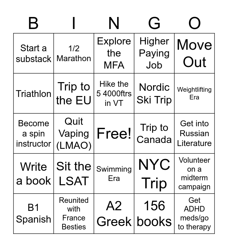 This bingo card has a free space and 24 words: B1 Spanish, Sit the LSAT, Hike the 5 4000ftrs in VT, 156 books, Move Out, Start a substack, 1/2 Marathon, Explore the MFA, Trip to Canada, Get into Russian Literature, Become a spin instructor, Trip to the EU, NYC Trip, Volunteer on a midterm campaign, Triathlon, Reunited with France Besties, A2 Greek, Higher Paying Job, Weightlifting Era, Write a book, Quit Vaping (LMAO), Swimming Era, Nordic Ski Trip and Get ADHD meds/go to therapy.