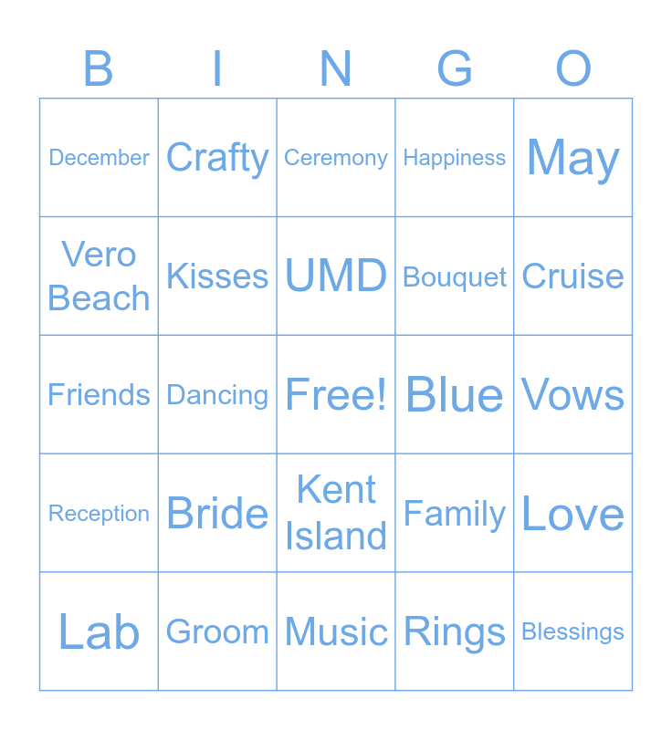 This bingo card has a free space and 24 words: Bride, Groom, UMD, Lab, May, December, Vero Beach, Crafty, Blue, Kent Island, Bouquet, Friends, Family, Love, Kisses, Rings, Vows, Ceremony, Cruise, Dancing, Blessings, Reception, Happiness and Music.