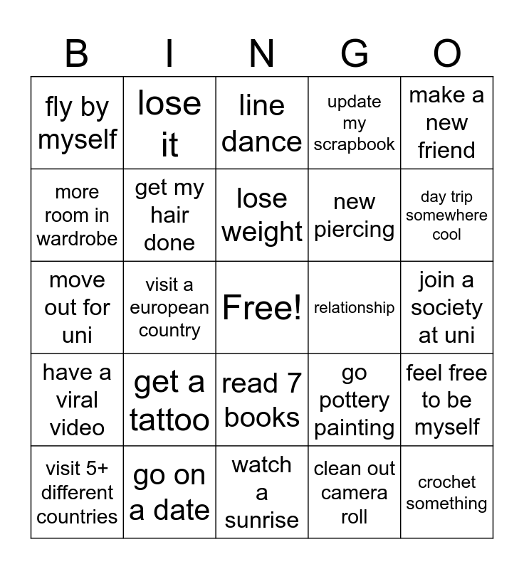This bingo card has a free space and 24 words: get a tattoo, go on a date, lose weight, visit 5+ different countries, make a new friend, fly by myself, more room in wardrobe, lose it, relationship, read 7 books, new piercing, move out for uni, go pottery painting, feel free to be myself, get my hair done, clean out camera roll, join a society at uni, line dance, day trip somewhere cool, visit a european country, crochet something, have a viral video, update my scrapbook and watch a sunrise.