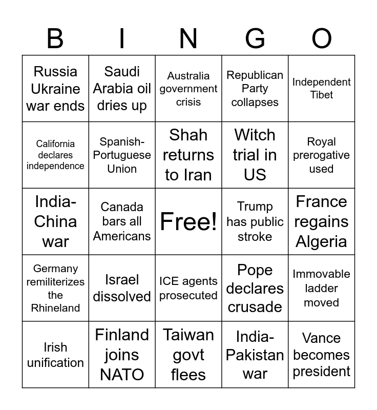 This bingo card has a free space and 24 words: Irish unification, Israel dissolved, Shah returns to Iran, India-Pakistan war, Independent Tibet, Russia Ukraine war ends, Saudi Arabia oil dries up, Australia government crisis, Trump has public stroke, France regains Algeria, India-China war, Spanish-Portuguese Union, Pope declares crusade, Immovable ladder moved, California declares independence, Finland joins NATO, Taiwan govt flees, Republican Party collapses, Royal prerogative used, Germany remiliterizes the Rhineland, Canada bars all Americans, ICE agents prosecuted, Witch trial in US and Vance becomes president.
