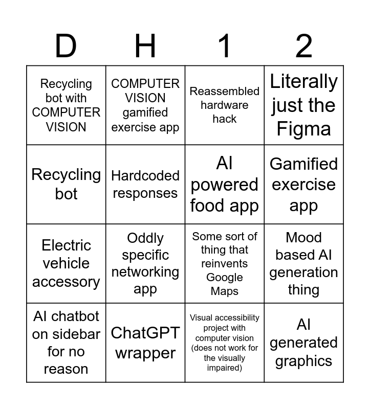 This bingo card has 25 words: "Computer vision" sign language teaching app, AI powered study app, Gamified exercise app, AI 'enhanced' calendar app, Recycling bot, Recycling bot with COMPUTER VISION, Hardcoded responses, COMPUTER VISION gamified exercise app, ChatGPT wrapper, Reused project, Electric vehicle accessory, Some sort of thing that reinvents Google Maps, Some sort of thing that reinvents banks, Some sort of thing that reinvents Github, AI powered food app, AI 'enhanced' budgeting app, Visual accessibility project with computer vision (does not work for the visually impaired), Reassembled hardware hack, Oddly specific networking app, Mood based AI generation thing, AI chatbot on sidebar for no reason, Crypto integration for no reason, AI generated graphics, Literally just the Figma and Medical app that violates at least one law.