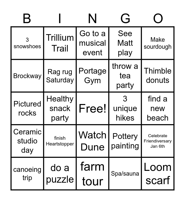 This bingo card has a free space and 24 words: finish Heartstopper, do a puzzle, Portage Gym, canoeing trip, Make sourdough, 3 snowshoes, Brockway, Trillium Trail, 3 unique hikes, Watch Dune, throw a tea party, Pictured rocks, Pottery painting, Celebrate Friendiversary Jan 6th, Rag rug Saturday, Spa/sauna, find a new beach, Go to a musical event, Thimble donuts, Healthy snack party, Loom scarf, Ceramic studio day, See Matt play and farm tour.