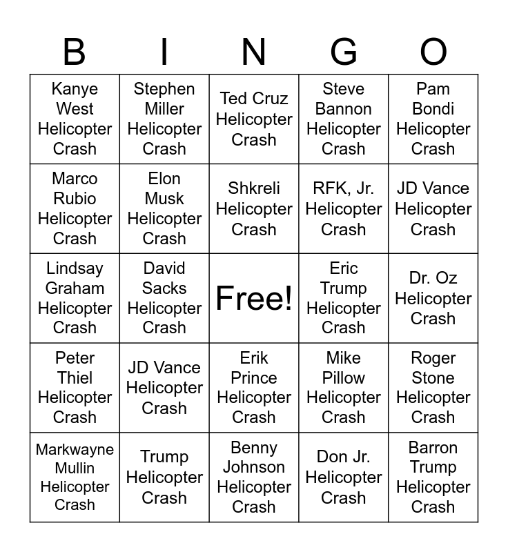 This bingo card has a free space and 24 words: JD Vance Helicopter Crash, Trump Helicopter Crash, Shkreli Helicopter Crash, Markwayne Mullin Helicopter Crash, Pam Bondi Helicopter Crash, Kanye West Helicopter Crash, Marco Rubio Helicopter Crash, Stephen Miller Helicopter Crash, Eric Trump Helicopter Crash, Erik Prince Helicopter Crash, RFK, Jr. Helicopter Crash, Lindsay Graham Helicopter Crash, Mike Pillow Helicopter Crash, Roger Stone Helicopter Crash, Elon Musk Helicopter Crash, Don Jr. Helicopter Crash, Dr. Oz Helicopter Crash, Ted Cruz Helicopter Crash, JD Vance Helicopter Crash, David Sacks Helicopter Crash, Barron Trump Helicopter Crash, Peter Thiel Helicopter Crash, Steve Bannon Helicopter Crash and Benny Johnson Helicopter Crash.
