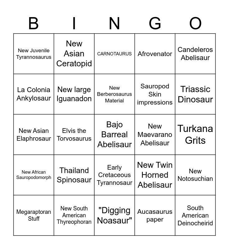This bingo card has 25 words: Thailand Spinosaur, "Digging Noasaur", New Berberosaurus Material, Megaraptoran Stuff, Candeleros Abelisaur, New Juvenile Tyrannosaurus, La Colonia Ankylosaur, New Asian Ceratopid, New Maevarano Abelisaur, Early Cretaceous Tyrannosaur, Sauropod Skin impressions, New Asian Elaphrosaur, New Twin Horned Abelisaur, New Notosuchian, New large Iguanadon, South American Deinocheirid, Turkana Grits, CARNOTAURUS, Triassic Dinosaur, Elvis the Torvosaurus, Bajo Barreal Abelisaur, New South American Thyreophoran, New African Sauropodomorph, Afrovenator and Aucasaurus paper.