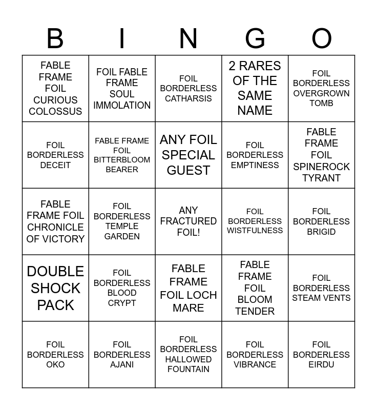 This bingo card has a free space and 24 words: FOIL BORDERLESS BLOOD CRYPT, FOIL BORDERLESS AJANI, ANY FOIL SPECIAL GUEST, FOIL BORDERLESS OKO, FOIL BORDERLESS OVERGROWN TOMB, FABLE FRAME FOIL CURIOUS COLOSSUS, FOIL BORDERLESS DECEIT, FOIL FABLE FRAME SOUL IMMOLATION, FOIL BORDERLESS WISTFULNESS, FABLE FRAME FOIL LOCH MARE, FOIL BORDERLESS EMPTINESS, FABLE FRAME FOIL CHRONICLE OF VICTORY, FABLE FRAME FOIL BLOOM TENDER, FOIL BORDERLESS STEAM VENTS, FABLE FRAME FOIL BITTERBLOOM BEARER, FOIL BORDERLESS VIBRANCE, FOIL BORDERLESS BRIGID, FOIL BORDERLESS CATHARSIS, FABLE FRAME FOIL SPINEROCK TYRANT, FOIL BORDERLESS TEMPLE GARDEN, FOIL BORDERLESS EIRDU, DOUBLE SHOCK PACK, 2 RARES OF THE SAME NAME and FOIL BORDERLESS HALLOWED FOUNTAIN.
