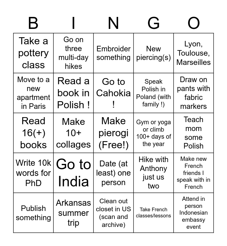 This bingo card has a free space and 24 words: Go to India, Arkansas summer trip, Go to Cahokia !, Publish something, Lyon, Toulouse, Marseilles, Take a pottery class, Move to a new apartment in Paris, Go on three multi-day hikes, Gym or yoga or climb 100+ days of the year, Date (at least) one person, Speak Polish in Poland (with family !), Read 16(+) books, Hike with Anthony just us two, Make new French friends I speak with in French, Read a book in Polish !, Take French classes/lessons, Teach mom some Polish, Embroider something, Draw on pants with fabric markers, Make 10+ collages, Attend in person Indonesian embassy event, Write 10k words for PhD, New piercing(s) and Clean out closet in US (scan and archive).