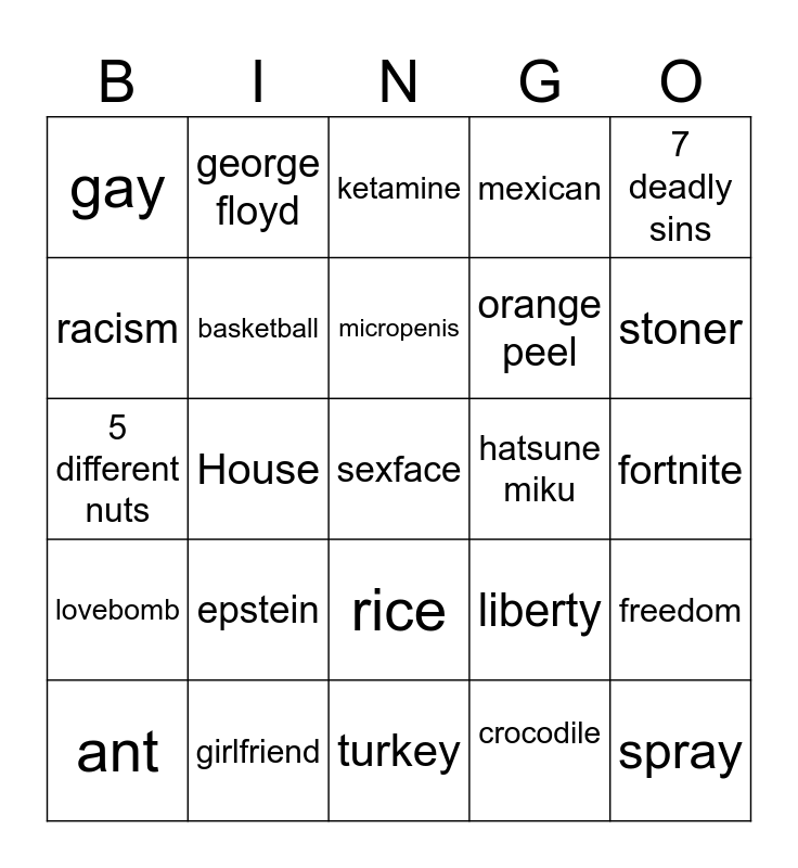 This bingo card has a free space and 24 words: epstein, girlfriend, micropenis, ant, 7 deadly sins, gay, racism, george floyd, hatsune miku, rice, orange peel, 5 different nuts, liberty, freedom, basketball, crocodile, fortnite, ketamine, stoner, House, spray, lovebomb, mexican and turkey.
