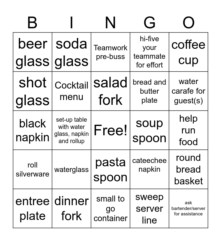 This bingo card has a free space and 24 words: waterglass, dinner fork, salad fork, entree plate, coffee cup, beer glass, shot glass, soda glass, soup spoon, pasta spoon, bread and butter plate, black napkin, cateechee napkin, round bread basket, Cocktail menu, sweep server line, help run food, Teamwork pre-buss, water carafe for guest(s), set-up table with water glass, napkin and rollup, ask bartender/server for assistance, roll silverware, hi-five your teammate for effort and small to go container.