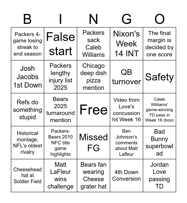 This bingo card has a free space and 39 words: Christian Watson leads Packers in rec. yards, Jordan Love playoff stats/highlights, NFL Playoff bracket, Packers lengthy injury list 2025, Cheesehead hat at Soldier Field, Missed FG, Chicago deep dish pizza mention, Jayden Reed TD, The final margin is decided by one score, Historical montage, NFL's oldest rivalry, Bears 2025 turnaround mention, Nixon's Week 14 INT, Jordan Love passing TD, Caleb Williams' game-winning TD pass in Week 16 (boo), Video from Love's concussion hit Week 16, Packers-Bears 2010 NFC title game highlights, Chicago weather mention, Packers 4-game losing streak to end season, Aaron Rodgers discussion, Ben Johnson's comments about Matt Lafleur, Josh Jacobs 1st Down, Bears fan wearing Cheese grater hat, QB turnover, Safety, Jordan Love rushing TD, Josh Jacobs TD, Tucker Kraft ACL mention, Micah Parsons trade mention, Beer ad, False start, Go for it on 4th Down, Packers 30+ yard pass, Packers sack Caleb Williams, Matt LaFleur wins challenge, 4th Down Conversion, Brett Favre mention, Bad Bunny superbowl ad, Refs do something stupid and Packers TD.