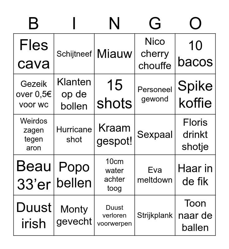 This bingo card has a free space and 24 words: Popo bellen, Monty gevecht, 15 shots, Duust irish, 10 bacos, Fles cava, Gezeik over 0,5€ voor wc, Schijtneef, Sexpaal, 10cm water achter toog, Personeel gewond, Weirdos zagen tegen aron, Eva meltdown, Haar in de fik, Klanten op de bollen, Strijkplank, Floris drinkt shotje, Miauw, Spike koffie, Hurricane shot, Toon naar de ballen, Beau 33’er, Nico cherry chouffe and Duust verloren voorwerpen.