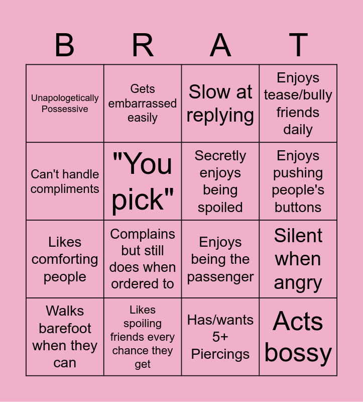This bingo card has 16 words: Likes spoiling friends every chance they get, Silent when angry, Slow at replying, Unapologetically Possessive, Likes comforting people, Gets embarrassed easily, Enjoys being the passenger, Has/wants 5+ Piercings, Can't handle compliments, "You pick", Walks barefoot when they can, Enjoys tease/bully friends daily, Complains but still does when ordered to, Enjoys pushing people's buttons, Secretly enjoys being spoiled and Acts bossy.