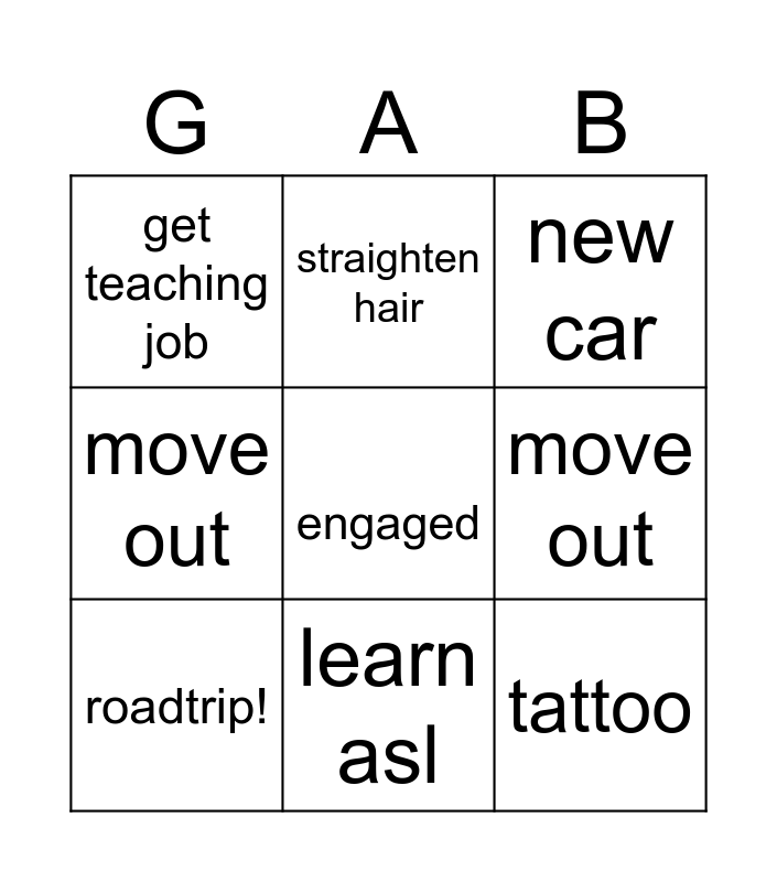This bingo card has 17 words: quit cfa, no more bangs, new car, get teaching job, learn asl, move out, 50k in savings, engaged, tattoo, roadtrip!, me go weinerschnitzel, go on plane, move out, straighten hair, get drunk, meet all his siblings and buc-ees!.
