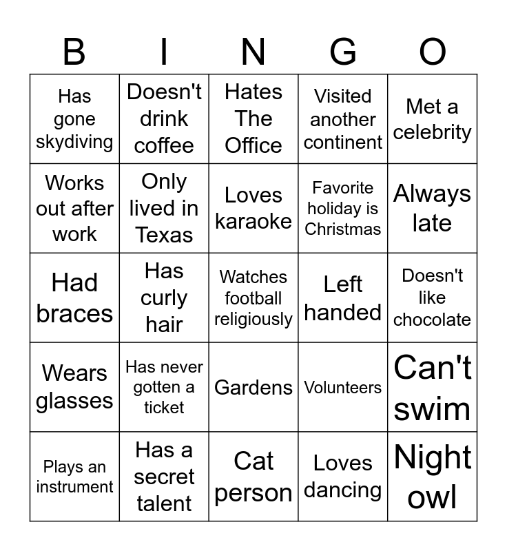 This bingo card has 35 words: Owns own business, 3 or more vowels in 1st name, 3 or more kids, Only lived in Texas, Gardens, Visited another continent, Works out after work, Fluent in another language, Loves karaoke, Your host, Had braces, Met a celebrity, Owns horses, Born in a different state/country, Has gone skydiving, Left handed, Loves dancing, Has curly hair, Wears glasses, Watches football religiously, Volunteers, Plays an instrument, Can't swim, Has a secret talent, Hates The Office, Always late, Night owl, Favorite color is green, Favorite holiday is Christmas, Doesn't like chocolate, Skipped breakfast this morning, Cat person, Has never gotten a ticket, Doesn't drink coffee and Has a tattoo.