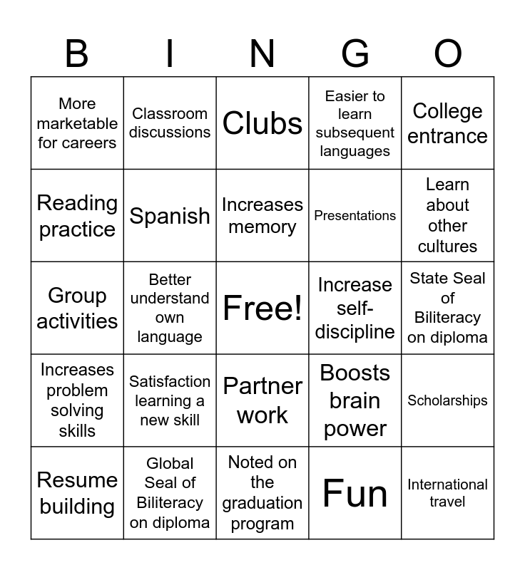This bingo card has a free space and 36 words: Latin, German, French, Spanish, Boosts brain power, Increases problem solving skills, Increases memory, Travel, College entrance, Higher standardized test scores, Better understand own language, Easier to learn subsequent languages, Improved academic performance, Increase self-discipline, Learn about other cultures, More marketable for careers, Opens up your world to more people, Satisfaction learning a new skill, International travel, Clubs, State Seal of Biliteracy on diploma, Scholarships, Global Seal of Biliteracy on diploma, Resume building, Noted on the graduation program, Classroom discussions, Group activities, Projects, Presentations, Reading practice, Writing practice, Performance-based assessments, Fun, Partner work, Arabic and Italian.