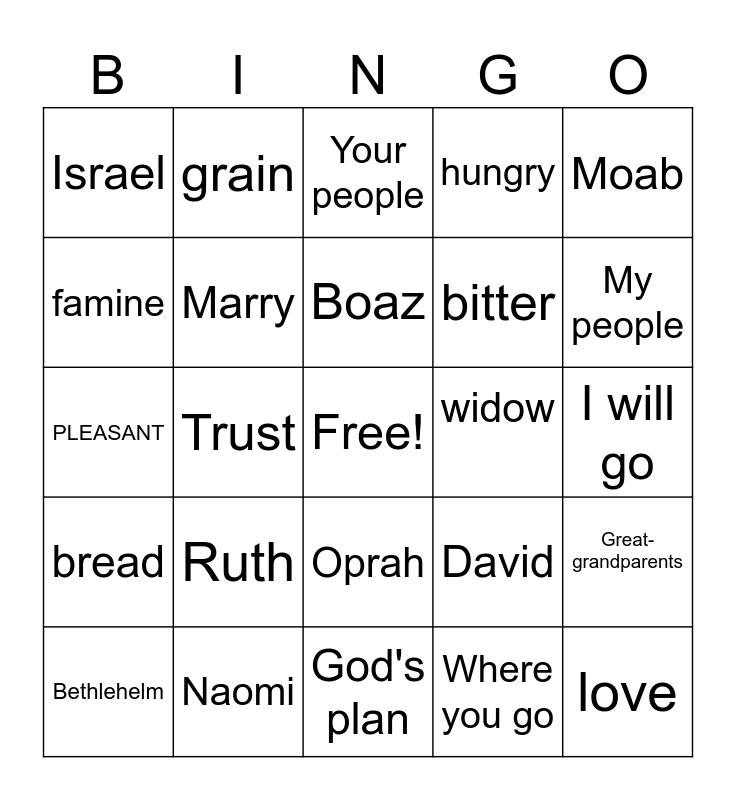 This bingo card has a free space and 24 words: Ruth, Naomi, Boaz, Bethlehelm, Moab, Israel, famine, grain, widow, Oprah, bitter, PLEASANT, David, Great-grandparents, Marry, Where you go, I will go, Your people, My people, Trust, love, bread, hungry and God's plan.