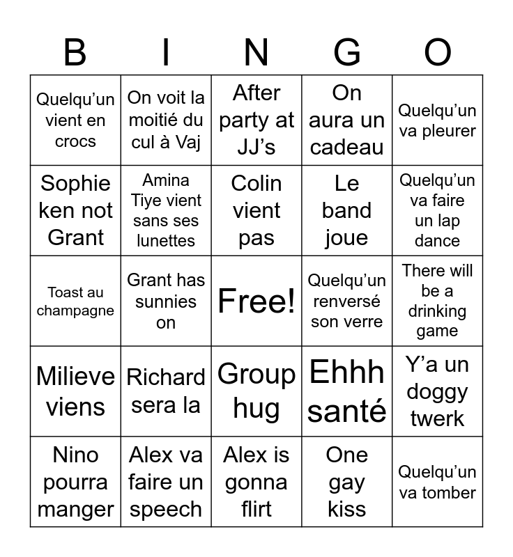 This bingo card has a free space and 24 words: Richard sera la, Alex va faire un speech, Colin vient pas, Nino pourra manger, Quelqu’un va pleurer, Quelqu’un vient en crocs, Sophie ken not Grant, On voit la moitié du cul à Vaj, Quelqu’un renversé son verre, Group hug, Le band joue, Toast au champagne, Ehhh santé, Y’a un doggy twerk, Amina Tiye vient sans ses lunettes, One gay kiss, There will be a drinking game, After party at JJ’s, Quelqu’un va faire un lap dance, Grant has sunnies on, Quelqu’un va tomber, Milieve viens, On aura un cadeau and Alex is gonna flirt.