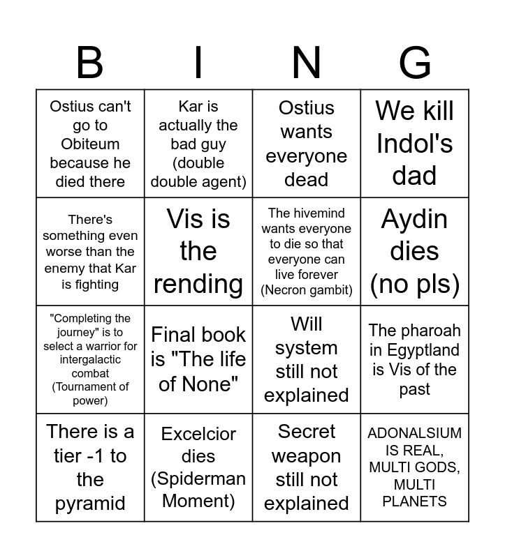 This bingo card has 16 words: Excelcior dies (Spiderman Moment), The pharoah in Egyptland is Vis of the past, Ostius wants everyone dead, Ostius can't go to Obiteum because he died there, "Completing the journey" is to select a warrior for intergalactic combat (Tournament of power), Kar is actually the bad guy (double double agent), Will system still not explained, Secret weapon still not explained, There's something even worse than the enemy that Kar is fighting, Vis is the rending, There is a tier -1 to the pyramid, We kill Indol's dad, Final book is "The life of None", Aydin dies (no pls), The hivemind wants everyone to die so that everyone can live forever (Necron gambit) and ADONALSIUM IS REAL, MULTI GODS, MULTI PLANETS.