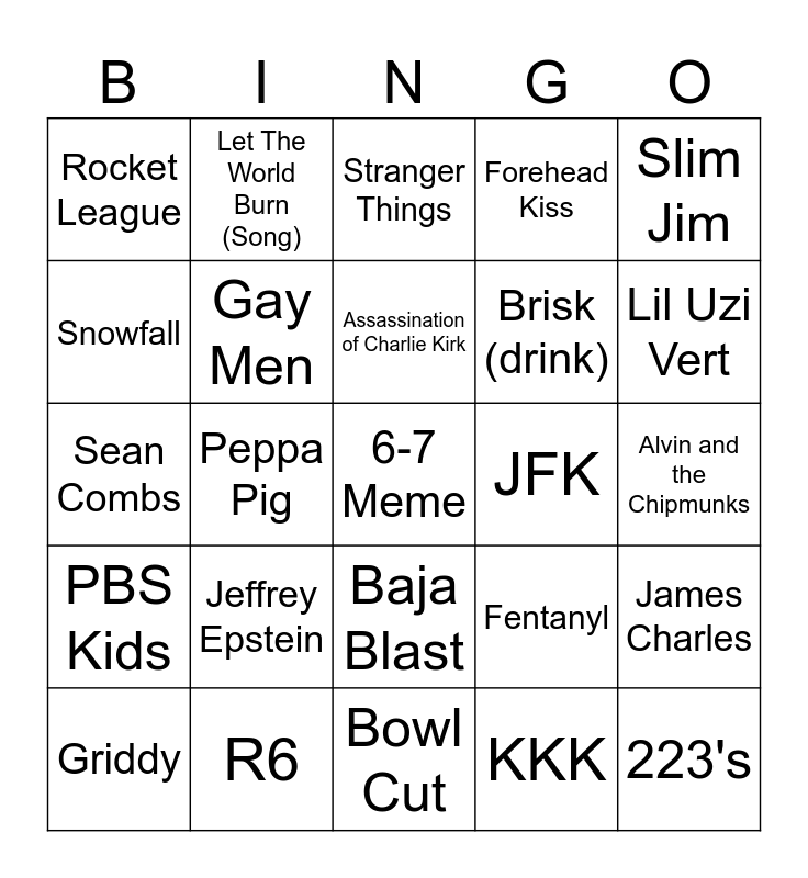 This bingo card has a free space and 24 words: Jeffrey Epstein, R6, Assassination of Charlie Kirk, Griddy, Slim Jim, Rocket League, Snowfall, Let The World Burn (Song), JFK, Baja Blast, Brisk (drink), Sean Combs, Fentanyl, James Charles, Gay Men, KKK, Alvin and the Chipmunks, Stranger Things, Lil Uzi Vert, Peppa Pig, 223's, PBS Kids, Forehead Kiss and Bowl Cut.