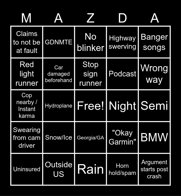 This bingo card has a free space and 24 words: Snow/Ice, Outside US, Stop sign runner, Uninsured, Banger songs, Claims to not be at fault, Red light runner, GDNMTE, Night, Georgia/GA, Podcast, Cop nearby / Instant karma, "Okay Garmin", BMW, Car damaged beforehand, Horn hold/spam, Semi, No blinker, Wrong way, Hydroplane, Argument starts post crash, Swearing from cam driver, Highway swerving and Rain.
