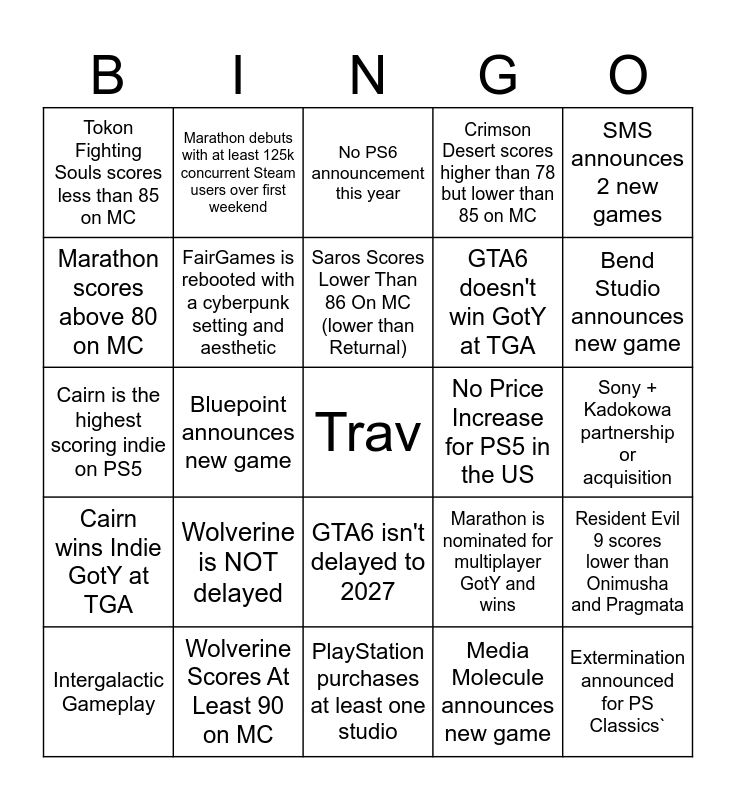 This bingo card has a free space and 24 words: Wolverine is NOT delayed, Wolverine Scores At Least 90 on MC, Saros Scores Lower Than 86 On MC (lower than Returnal), Intergalactic Gameplay, SMS announces 2 new games, Tokon Fighting Souls scores less than 85 on MC, Marathon scores above 80 on MC, Marathon debuts with at least 125k concurrent Steam users over first weekend, No Price Increase for PS5 in the US, GTA6 isn't delayed to 2027, GTA6 doesn't win GotY at TGA, Cairn is the highest scoring indie on PS5, Marathon is nominated for multiplayer GotY and wins, Resident Evil 9 scores lower than Onimusha and Pragmata, FairGames is rebooted with a cyberpunk setting and aesthetic, Media Molecule announces new game, Sony + Kadokowa partnership or acquisition, No PS6 announcement this year, Bend Studio announces new game, Bluepoint announces new game, Extermination announced for PS Classics`, Cairn wins Indie GotY at TGA, Crimson Desert scores higher than 78 but lower than 85 on MC and PlayStation purchases at least one studio.