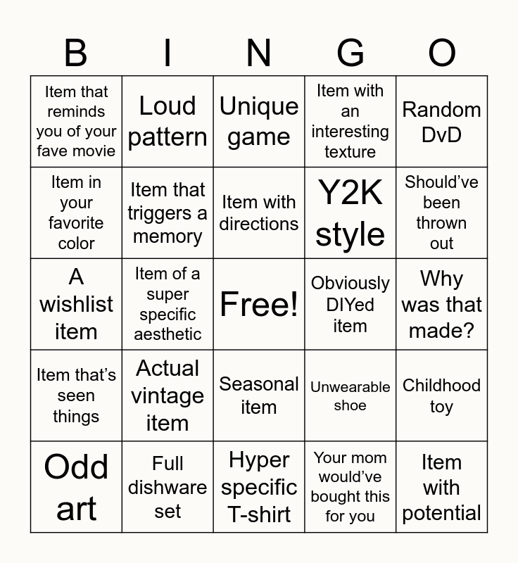 This bingo card has a free space and 29 words: Full book series, Full dishware set, Unique game, Brand new item, Random DvD, Item that reminds you of your fave movie, Item that triggers a memory, Item with directions, Obviously DIYed item, Childhood toy, Odd art, Item of a super specific aesthetic, Your mom would’ve bought this for you, Item with potential, A wishlist item, Your grandma probably had it, Hyper specific T-shirt, Unwearable shoe, Should’ve been thrown out, Item that’s seen things, Actual vintage item, An item for someone else, Y2K style, Why was that made?, Item in your favorite color, Loud pattern, Seasonal item, Item with an interesting texture and BELL.