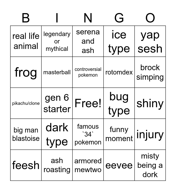 This bingo card has a free space and 24 words: dark type, ash roasting, controversial pokemon, feesh, yap sesh, real life animal, frog, legendary or mythical, bug type, famous `34` pokemon, rotomdex, pikachu/clone, funny moment, injury, masterball, eevee, shiny, serena and ash, brock simping, gen 6 starter, misty being a dork, big man blastoise, ice type and armored mewtwo.