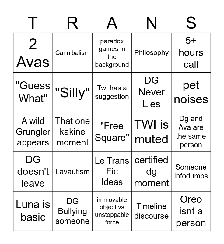 This bingo card has a free space and 24 words: Lavautism, DG Bullying someone, Twi has a suggestion, Luna is basic, 5+ hours call, 2 Avas, "Guess What", Cannibalism, TWI is muted, Le Trans Fic Ideas, DG Never Lies, A wild Grungler appears, certified dg moment, Someone Infodumps, "Silly", Timeline discourse, Dg and Ava are the same person, paradox games in the background, pet noises, That one kakine moment, Oreo isnt a person, DG doesn't leave, Philosophy and immovable object vs unstoppable force.