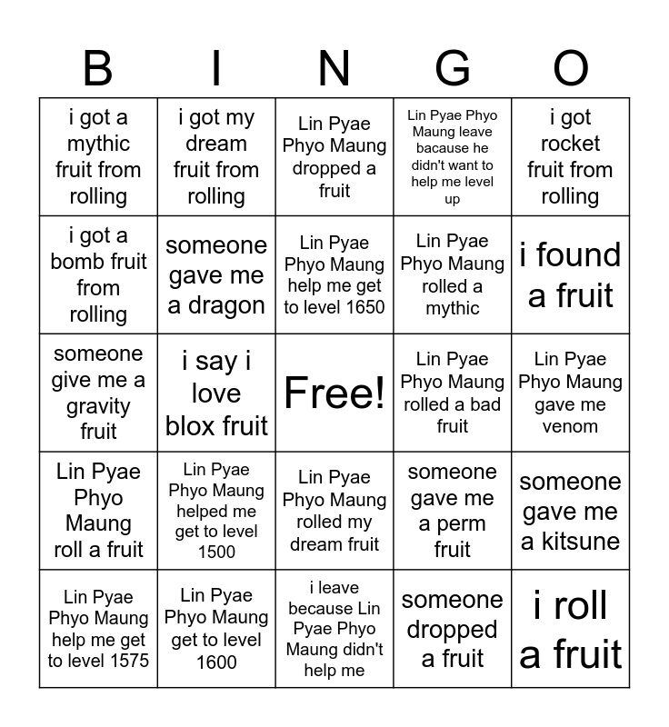 This bingo card has a free space and 24 words: Lin Pyae Phyo Maung helped me get to level 1500, Lin Pyae Phyo Maung get to level 1600, Lin Pyae Phyo Maung help me get to level 1650, Lin Pyae Phyo Maung help me get to level 1575, i got rocket fruit from rolling, i got a mythic fruit from rolling, i got a bomb fruit from rolling, i got my dream fruit from rolling, Lin Pyae Phyo Maung rolled a bad fruit, Lin Pyae Phyo Maung rolled my dream fruit, Lin Pyae Phyo Maung rolled a mythic, someone give me a gravity fruit, someone gave me a perm fruit, someone gave me a kitsune, someone gave me a dragon, someone dropped a fruit, Lin Pyae Phyo Maung gave me venom, Lin Pyae Phyo Maung dropped a fruit, i found a fruit, i say i love blox fruit, i roll a fruit, Lin Pyae Phyo Maung roll a fruit, Lin Pyae Phyo Maung leave bacause he didn't want to help me level up and i leave because Lin Pyae Phyo Maung didn't help me.