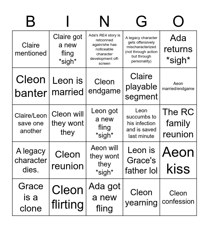 This bingo card has a free space and 24 words: Cleon reunion, Cleon flirting, Cleon endgame, Grace is a clone, Ada returns *sigh*, Claire mentioned, Cleon banter, Claire got a new fling *sigh*, Leon succumbs to his infection and is saved last minute, Aeon will they wont they *sigh*, Claire playable segment, Claire/Leon save one another, Leon is Grace's father lol, Aeon kiss, Leon is married, Cleon yearning, The RC family reunion, Ada's RE4 story is retconned again/she has noticeable character development off-screen, Aeon married/endgame, Cleon will they wont they, Cleon confession, A legacy character dies., A legacy character gets offensively mischaracterized (not through action but through personality) and Ada got a new fling.
